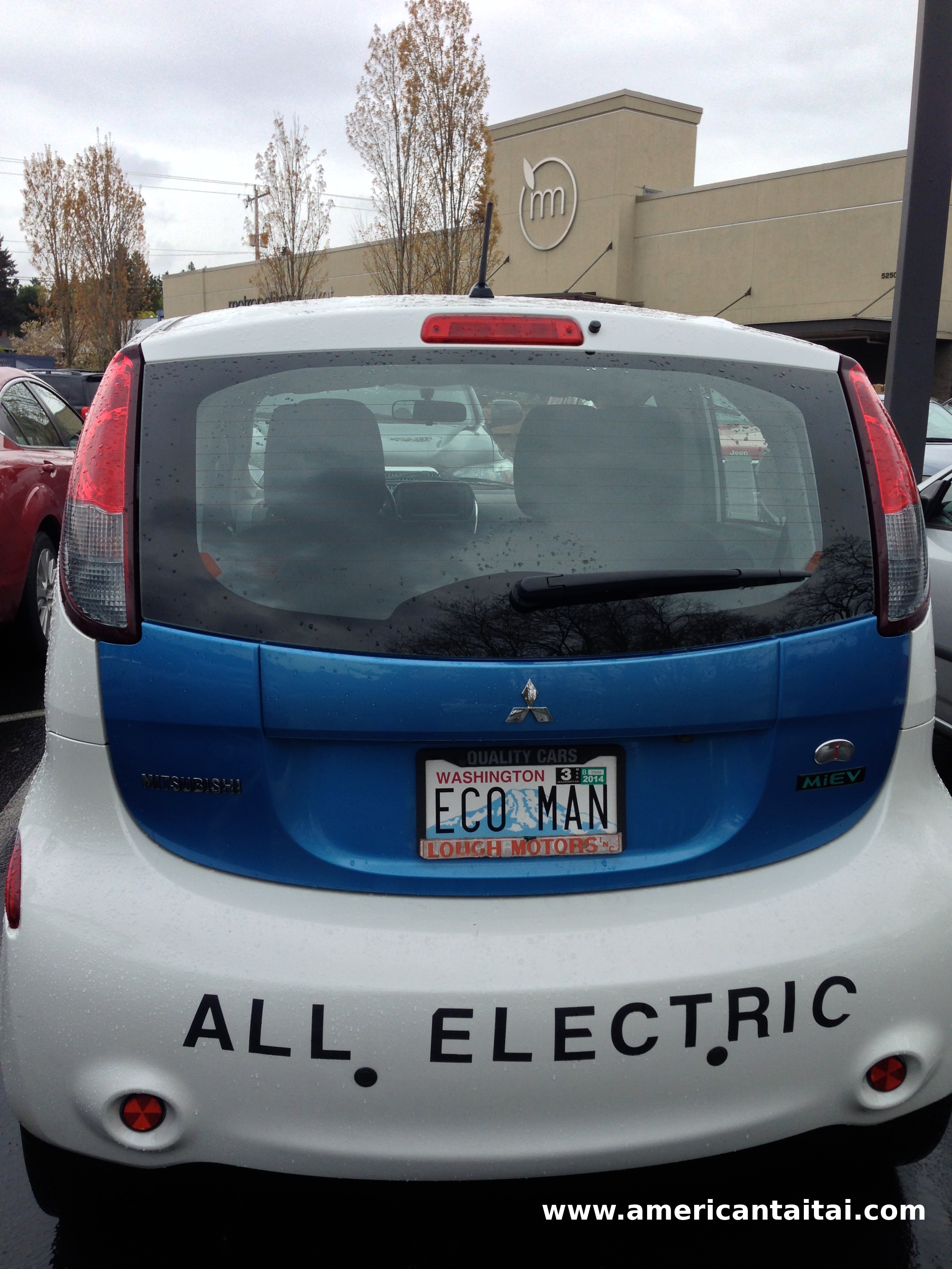 We had managed to slide right next to the glorified electric golf cart that had swiftly cut me off twice almost a year ago. The driver, whom I dubbed “Mr. Eco” because that’s what I *thought* his vanity plates read, was nowhere to be seen. His car, on the other hand, was quite conspicuous. And I stand corrected. Apparently the vanity plates did not read “Mr. Eco,” but “ECO MAN.” Even better.