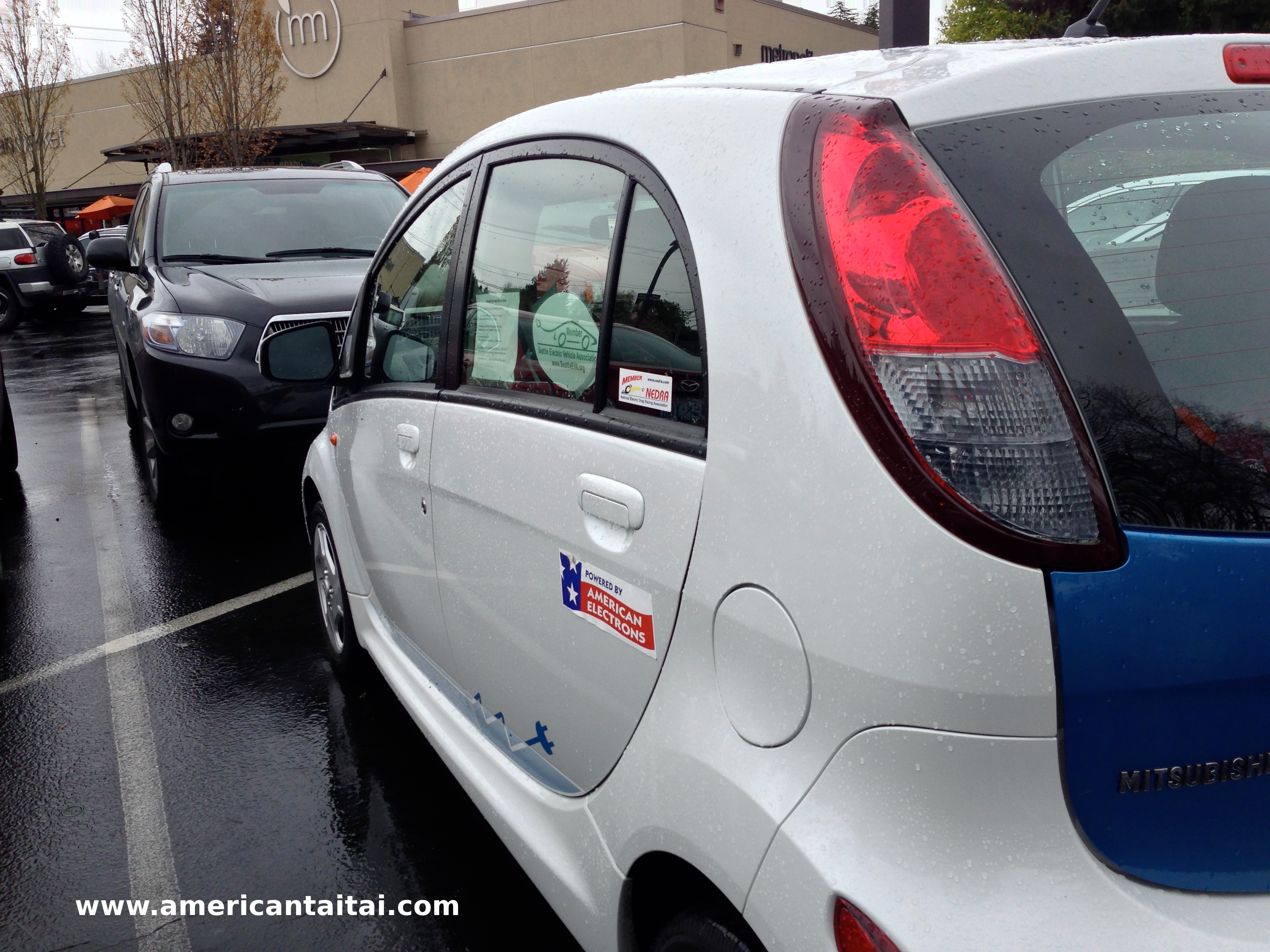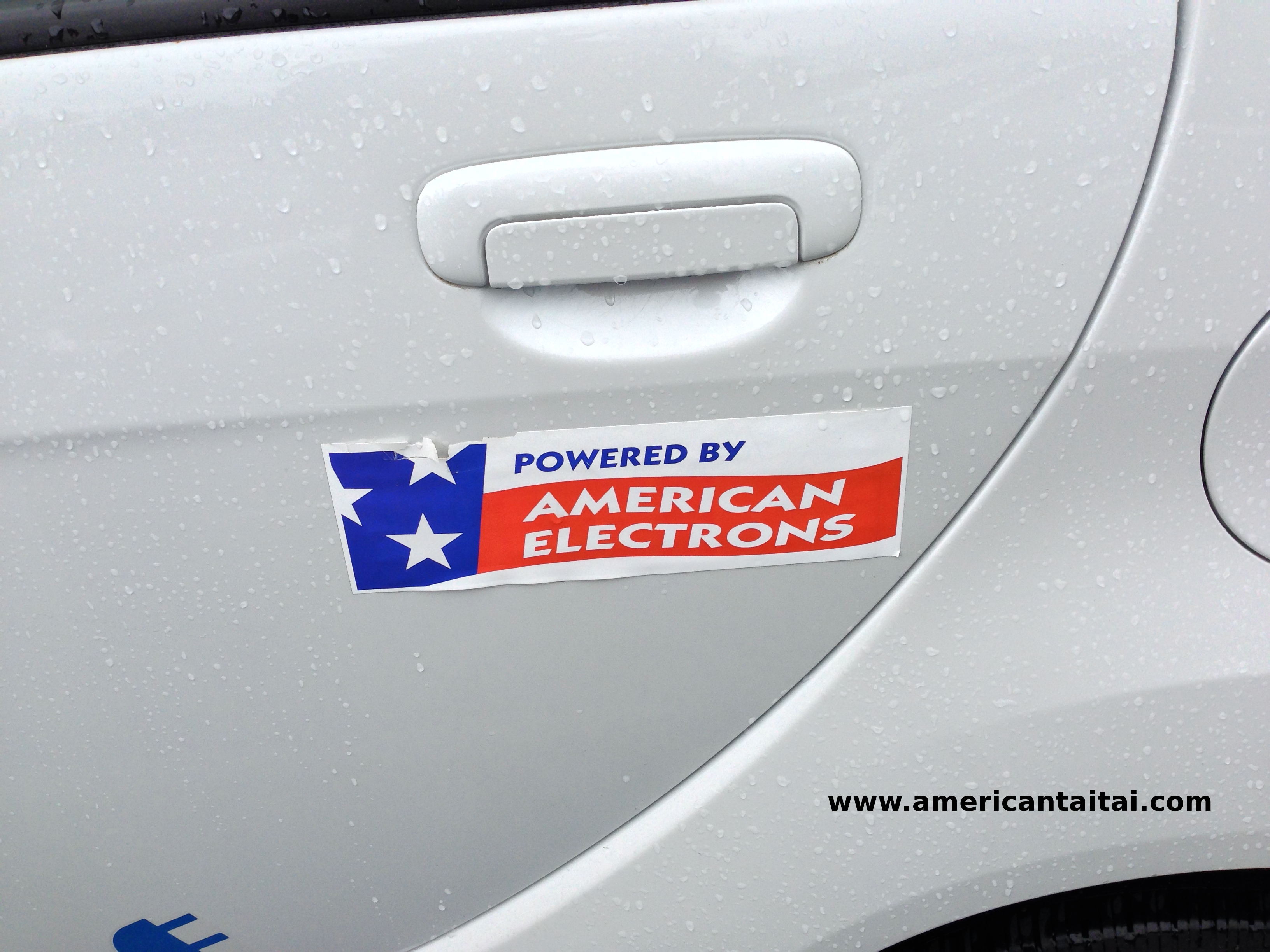 After taking a few pictures and circling the car, I came across two identical bumper-sized stickers that weren’t actually affixed to the bumper, since the words “ALL ELECTRIC” took up the entire rear bumper. Instead the two bumper-sized stickers were noticeably affixed to the center of both sides of the rear passenger doors. I hadn’t seen the stickers last year as I was waging road-rage war with Mr. Eco/Eco Man, but now I finally saw what the stickers read: